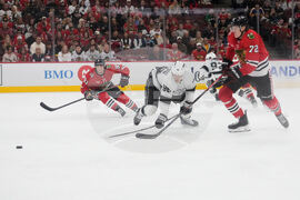 Los Angeles Kings defenseman Drew Doughty, left, center Phillip Danault, right, defend Chicago Blackhawks center Frank Nazar, center, during the third period of an NHL hockey game, Sunday, Oct. 26, 2025, in Chicago. (AP Photo/David Banks)