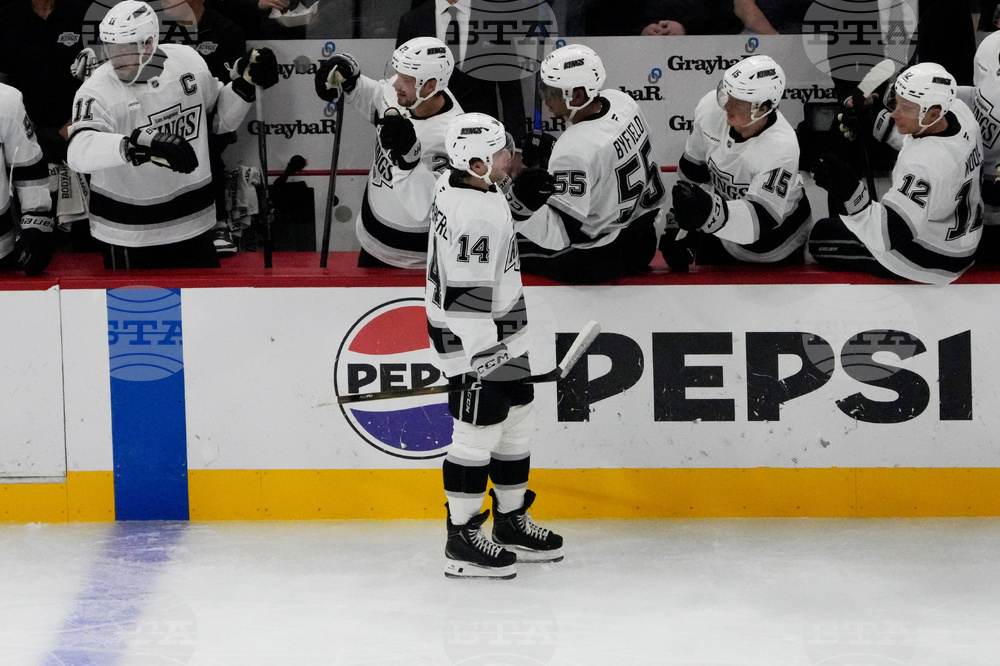 Los Angeles Kings left wing Kevin Fiala (22) celebrates after his goal against the Chicago Blackhawks during the second period of an NHL hockey game Sunday, Oct. 26, 2025, in Chicago. (AP Photo/David Banks)