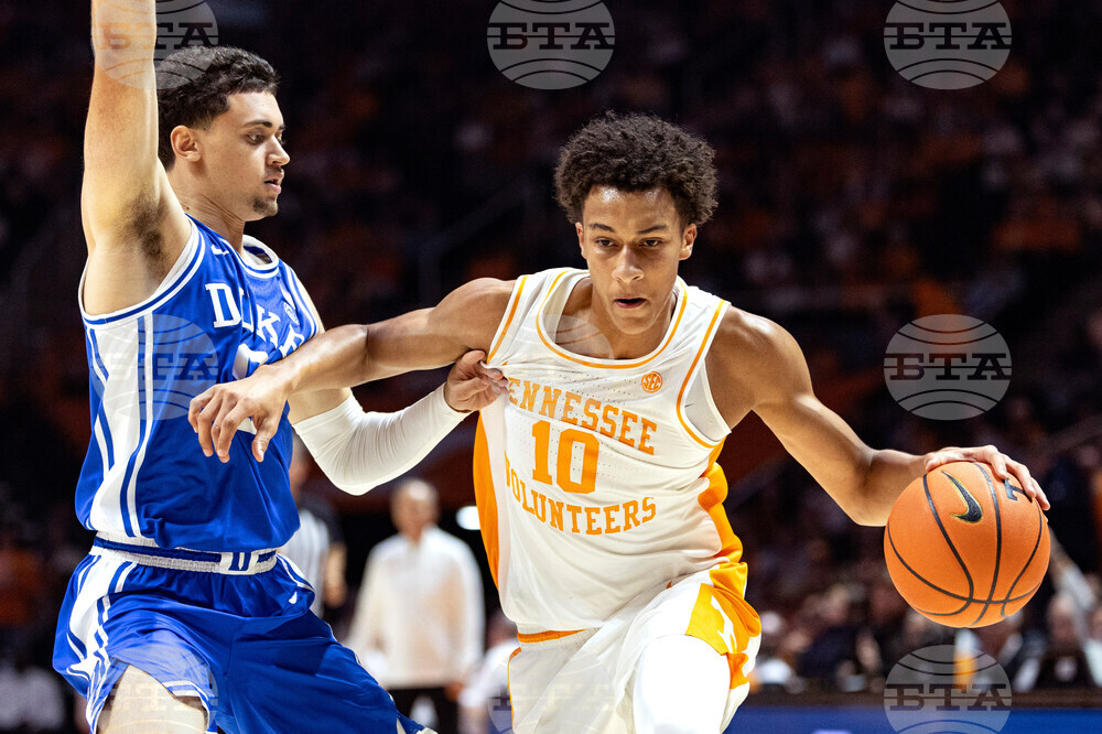 Tennessee forward Nate Ament (10) drives against Duke guard Dame Sarr (7) during the first half of an NCAA college basketball exhibition game Sunday, Oct. 26, 2025, in Knoxville, Tenn. (AP Photo/Wade Payne)