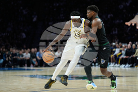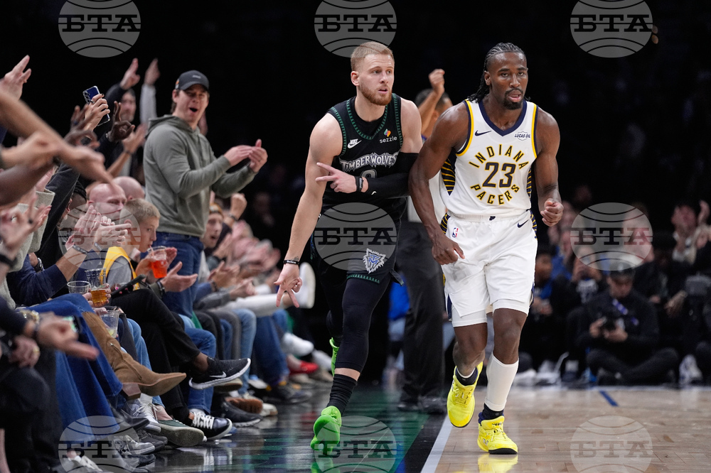 Minnesota Timberwolves guard Donte DiVincenzo, center left, gestures next to Indiana Pacers guard Aaron Nesmith (23) after making a basket during the first half of an NBA basketball game, Sunday, Oct. 26, 2025, in Minneapolis. (AP Photo/Abbie Parr)
