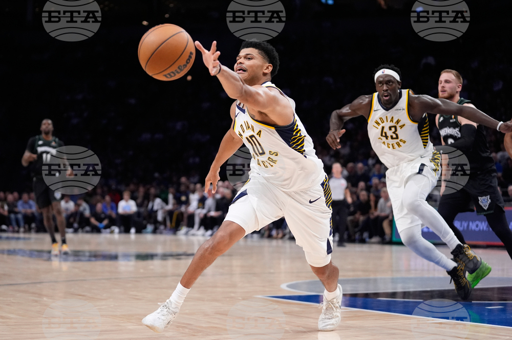 Indiana Pacers guard RayJ Dennis (10) reaches for possession of the ball during the second half of an NBA basketball game against the Minnesota Timberwolves, Sunday, Oct. 26, 2025, in Minneapolis. (AP Photo/Abbie Parr)