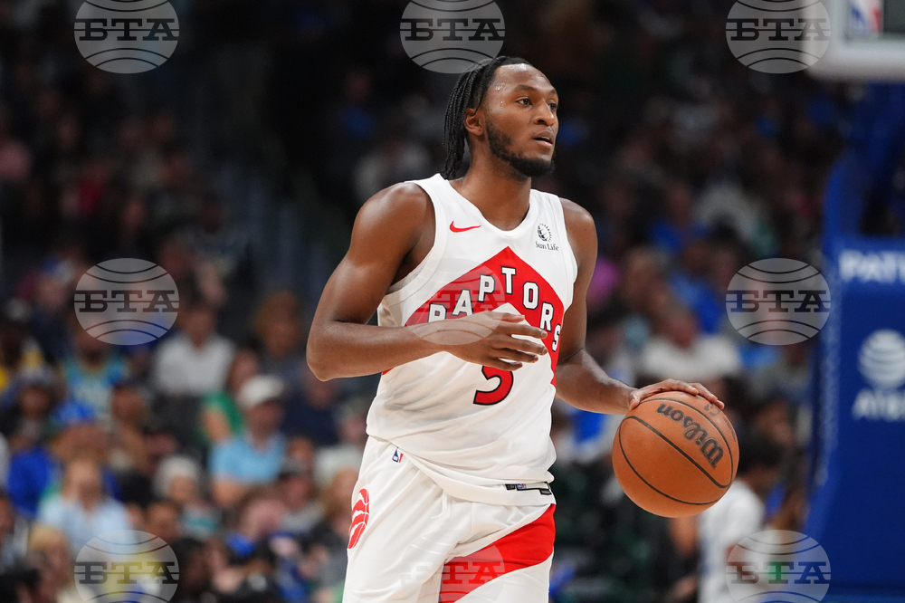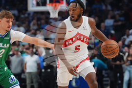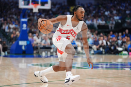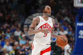 Toronto Raptors guard Immanuel Quickley dribbles during the second half of an NBA basketball game against the Dallas Mavericks in Dallas, Sunday, Oct. 26, 2025. (AP Photo/LM Otero)