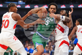 Dallas Mavericks forward P.J. Washington (25) drives between Toronto Raptors guards Ochai Agbaji (30) and Immanuel Quickley (5) during the first half of an NBA basketball game in Dallas, Sunday, Oct. 26, 2025. (AP Photo/LM Otero)