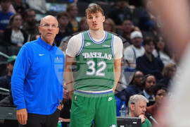 Dallas Mavericks head coach Jason Kidd, left, looks on from the sidelines with forward Cooper Flagg (32) during the second half of an NBA basketball game against the Toronto Raptors in Dallas, Sunday, Oct. 26, 2025. (AP Photo/LM Otero)