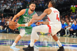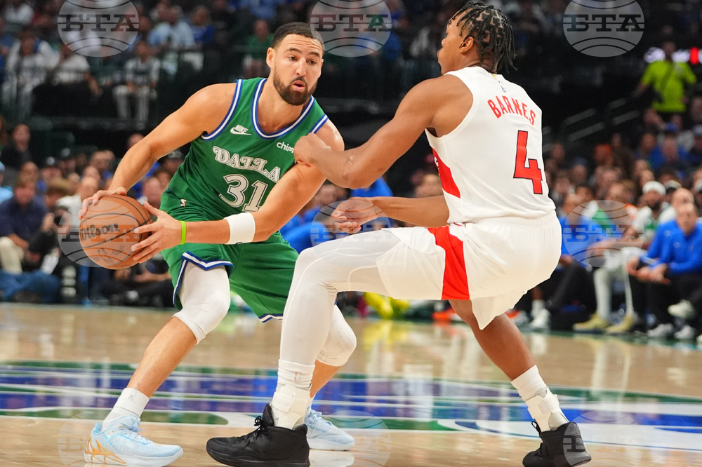 Dallas Mavericks guard Klay Thompson (31) looks to move the ball against Toronto Raptors forward Scottie Barnes (4) during the first half of an NBA basketball game basketball game in Dallas, Sunday, Oct. 26, 2025. (AP Photo/LM Otero)