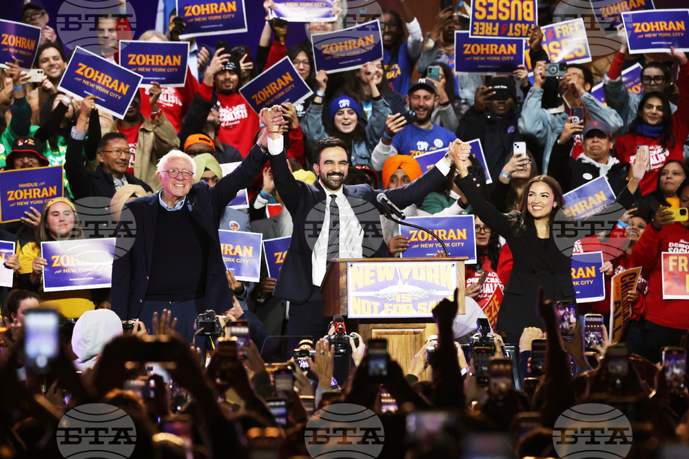 Sen. Bernie Sanders, I-Vt., left, New York City mayoral candidate Zohran Mamdani, center, and Rep. Alexandria Ocasio-Cortez, D-N.Y., appear on stage during a rally, Sunday, Oct. 26, 2025, in New York. (AP Photo/Heather Khalifa)