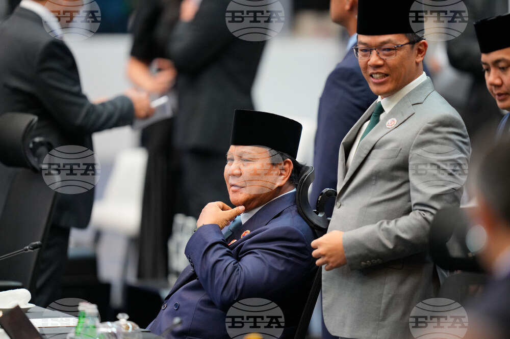 Indonesian President Prabowo Subianto, left and Indonesia's Foreign Minister Sugiono waiting for start of the 28th ASEAN Plus Three Summit in Kuala Lumpur, Malaysia, Monday, Oct. 27, 2025. (AP Photo/Vincent Thian, Pool)