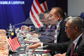 Canada's Prime Minister Mark Carney, left, meets with Malaysia's Prime Minister Anwar Ibrahim, second right, during a bilateral meeting on the sidelines of the Association of Southeast Asian Nations (ASEAN) Summit at the Kuala Lumpur Convention Centre (KLCC) in Kuala Lumpur, Malaysia, Monday, Oct. 27, 2025. (Fazry Ismail/Pool Photo via AP)
