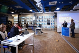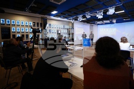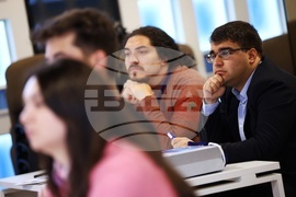 София (27 октомври 2025) Обучение за млади журналисти от националните и регионалните медии в България, организирано от Българската телеграфна агенция (БТА) в партньорство с Европейския парламент (ЕП), се провежда в зала „МаксиМ“ на БТА. Представяне на проекта, подробности за програмата на обучението и насоки за практическите задачи. На снимката: генералният директор на БТА Кирил Вълчев (втори отдясно), и ръководителят на Бюрото на ЕП в България Теодор Стойчев (вдясно).