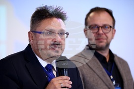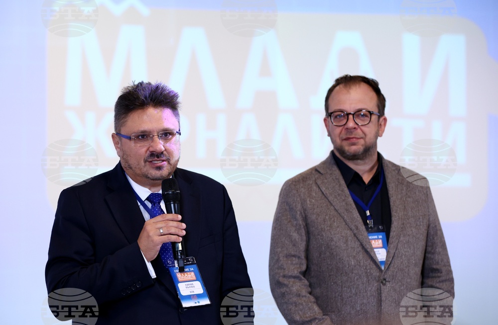 София (27 октомври 2025) Обучение за млади журналисти от националните и регионалните медии в България, организирано от Българската телеграфна агенция (БТА) в партньорство с Европейския парламент (ЕП), се провежда в зала „МаксиМ“ на БТА. Представяне на проекта, подробности за програмата на обучението и насоки за практическите задачи. На снимката (от ляво надясно): генералният директор на БТА Кирил Вълчев и ръководителят на Бюрото на ЕП в България Теодор Стойчев.