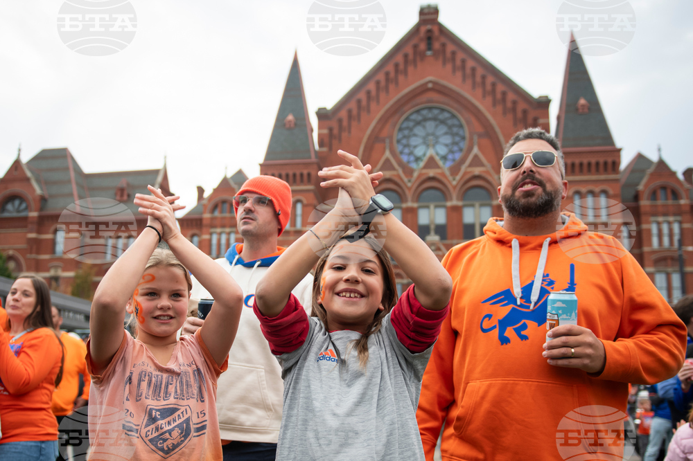 Young FC Cincinnati fans cheer in Washington Park in Cincinnati before Game 1 of the first round of MLS soccer's Eastern Conference playoffs against the Columbus Crew, Monday, Oct. 27, 2025. (AP Photo/Tanner Pearson)