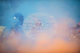 FC Cincinnati and Columbus Crew players take the field before Game 1 in the first round of MLS soccer's Eastern Conference playoffs, Monday, Oct. 27, 2025, in Cincinnati. (AP Photo/Tanner Pearson)