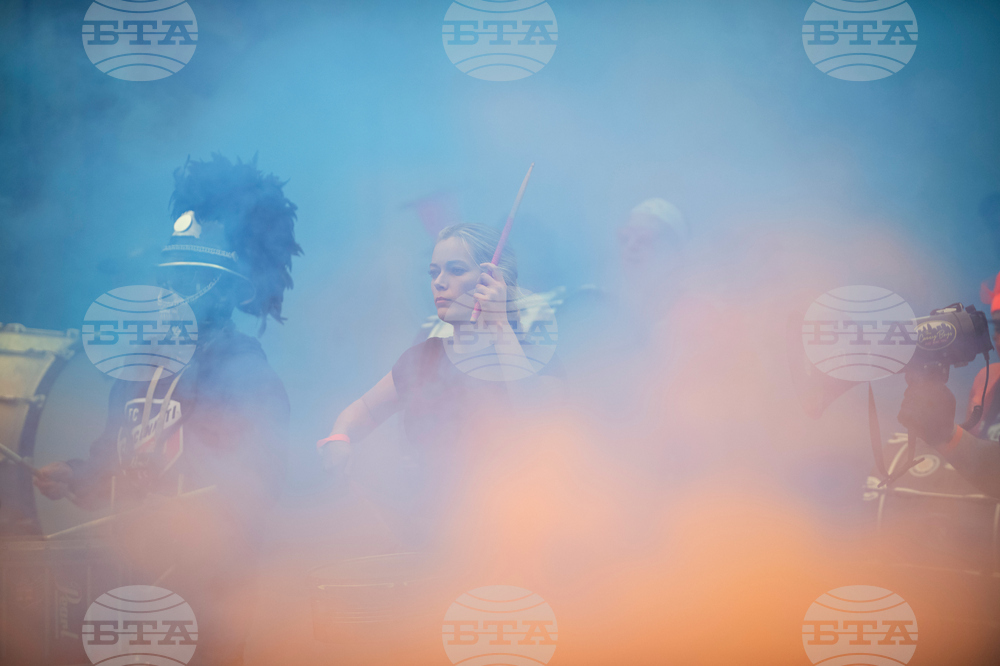 A parade of FC Cincinnati fans walk down Central Parkway in Cincinnati before Game 1 of the first round of MLS soccer's Eastern Conference playoffs against the Columbus Crew, Monday, Oct. 27, 2025. (AP Photo/Tanner Pearson)