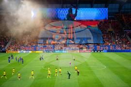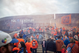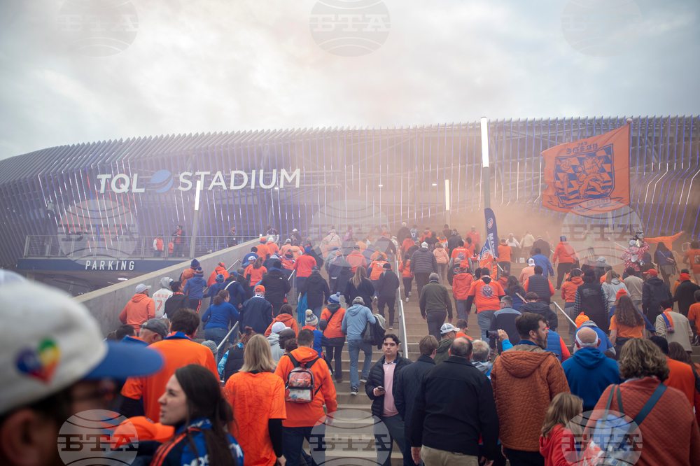 Fans walk up the stairs to TQL Stadium in Cincinnati before Game 1 of the first round of MLS soccer's Eastern Conference playoffs against the Columbus Crew, Monday, Oct. 27, 2025. (AP Photo/Tanner Pearson)
