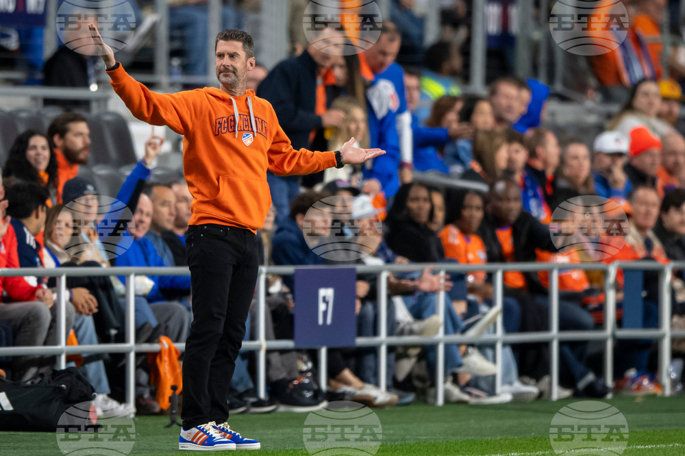 FC Cincinnati manager Pat Noonan, left, reacts after a play during the second half of Game 1 in the first round of MLS soccer's Eastern Conference playoffs against the Columbus Crew, Monday, Oct. 27, 2025, in Cincinnati. (AP Photo/Tanner Pearson)