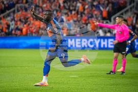 FC Cincinnati forward Kévin Denkey (9) celebrates while running downfield after scoring during the second half of Game 1 in the first round of MLS soccer's Eastern Conference playoffs against the Columbus Crew, Monday, Oct. 27, 2025, in Cincinnati. (AP Photo/Tanner Pearson)
