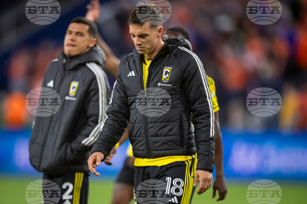 Columbus Crew defender Malte Amundsen (18) walks off the field after a loss to FC Cincinnati in Game 1 of the first round of MLS soccer's Eastern Conference playoffs, Monday, Oct. 27, 2025, in Cincinnati. (AP Photo/Tanner Pearson)