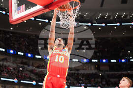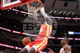 Atlanta Hawks forward Zaccharie Risacher (10) dunks the ball against the Chicago Bulls during the first half of an NBA basketball game Monday, Oct. 27, 2025, in Chicago. (AP Photo/David Banks)