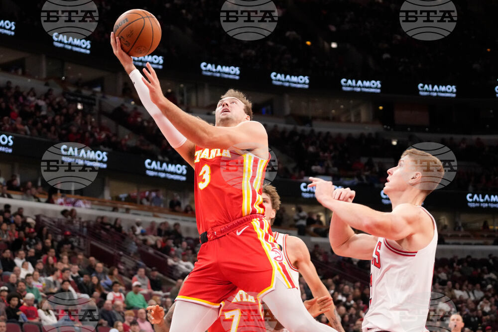 Chicago Bulls guard Kevin Huerter (13) and forward Jalen Smith (25) defend against Atlanta Hawks forward Mouhamed Gueye (18) during the first half of an NBA basketball game Monday, Oct. 27, 2025, in Chicago. (AP Photo/David Banks)