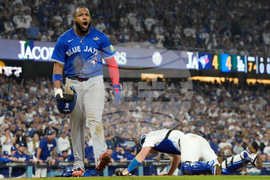 Toronto Blue Jays' Vladimir Guerrero Jr. celebrates past Los Angeles Dodgers catcher Will Smith after scoring on a single by Bo Bichette during the seventh inning in Game 3 of baseball's World Series, Monday, Oct. 27, 2025, in Los Angeles. (AP Photo/Brynn Anderson)