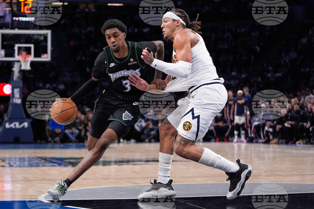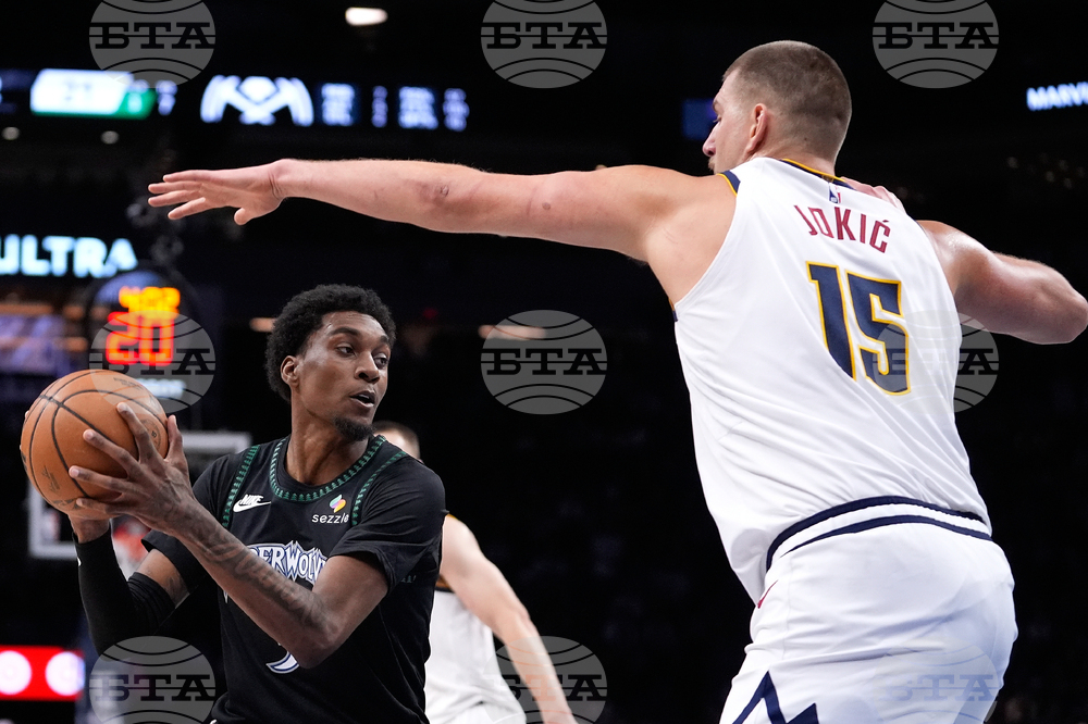 Minnesota Timberwolves forward Jaden McDaniels, left, works toward the basket as Denver Nuggets center Nikola Jokic (15) defends during the first half of an NBA basketball game, Monday, Oct. 27, 2025, in Minneapolis. (AP Photo/Abbie Parr)