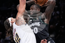 Minnesota Timberwolves center Naz Reid, right, works toward the basket as Denver Nuggets guard Bruce Brown defends during the first half of an NBA basketball game, Monday, Oct. 27, 2025, in Minneapolis. (AP Photo/Abbie Parr)