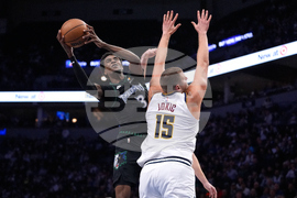 Minnesota Timberwolves forward Jaden McDaniels (3) looks to shoot over Denver Nuggets center Nikola Jokic (15) during the first half of an NBA basketball game, Monday, Oct. 27, 2025, in Minneapolis. (AP Photo/Abbie Parr)