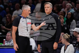 Minnesota Timberwolves head coach Chris Finch, right, talks with referee Scott Foster during the first half of an NBA basketball game against the Denver Nuggets, Monday, Oct. 27, 2025, in Minneapolis. (AP Photo/Abbie Parr)