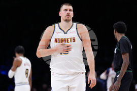 Denver Nuggets center Nikola Jokic walks across the court during the first half of an NBA basketball game against the Minnesota Timberwolves, Monday, Oct. 27, 2025, in Minneapolis. (AP Photo/Abbie Parr)