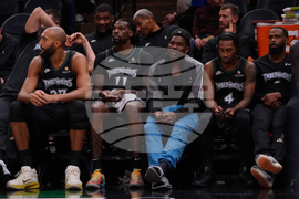 Minnesota Timberwolves center Rudy Gobert (27), center Naz Reid (11), guard Anthony Edwards (5), guard Rob Dillingham (4) and guard Mike Conley (10) watch play during the second half of an NBA basketball game against the Denver Nuggets, Monday, Oct. 27, 2025, in Minneapolis. (AP Photo/Abbie Parr)