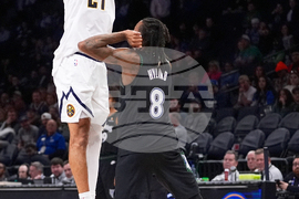 Denver Nuggets guard Peyton Watson (8) reacts next to Minnesota Timberwolves guard Mike Conley (10) after making a 3-point shot during the second half of an NBA basketball game, Monday, Oct. 27, 2025, in Minneapolis. (AP Photo/Abbie Parr)