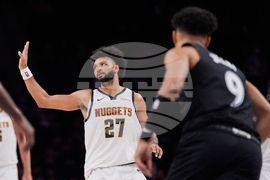 Denver Nuggets guard Jamal Murray (27) gestures after making a shot during the second half of an NBA basketball game against the Minnesota Timberwolves, Monday, Oct. 27, 2025, in Minneapolis. (AP Photo/Abbie Parr)