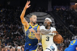 Golden State Warriors' Stephen Curry is fouled by Memphis Grizzlies' Cedric Coward in 2nd quarter during an NBA game in San Francisco on Monday, Oct. 27, 2025. (Scott Strazzante/San Francisco Chronicle via AP)
