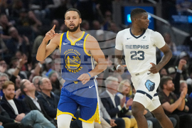 Golden State Warriors guard Stephen Curry (30) gestures after making a 3-point basket next to Memphis Grizzlies forward Cedric Coward (23) during the first half of an NBA basketball game in San Francisco, Monday, Oct. 27, 2025. (AP Photo/Jeff Chiu)