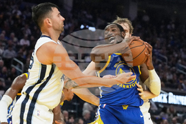 Golden State Warriors' Jonathan Kuminga is fouled by Memphis Grizzlies' John Konchar in 2nd quarter during an NBA game in San Francisco on Monday, Oct. 27, 2025. (Scott Strazzante/San Francisco Chronicle via AP)