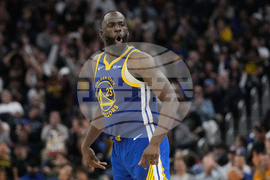 Golden State Warriors forward Draymond Green reacts toward the Memphis Grizzlies bench after making a 3-point basket during the second half of an NBA basketball game in San Francisco, Monday, Oct. 27, 2025. (AP Photo/Jeff Chiu)