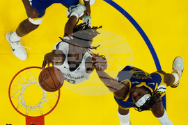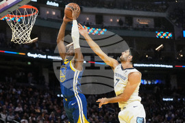 Memphis Grizzlies forward Cedric Coward, top, dunks over Golden State Warriors forward Jonathan Kuminga during the first half of an NBA basketball game in San Francisco, Monday, Oct. 27, 2025. (AP Photo/Jeff Chiu)