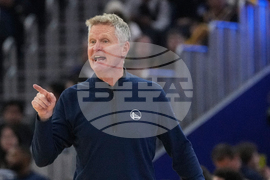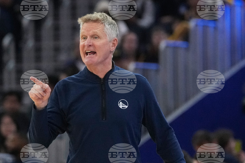 Golden State Warriors head coach Steve Kerr gestures toward players during the first half of an NBA basketball game against the Memphis Grizzlies in San Francisco, Monday, Oct. 27, 2025. (AP Photo/Jeff Chiu)