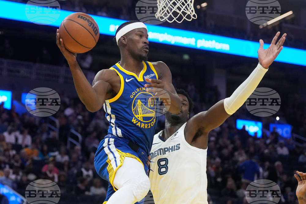 Golden State Warriors forward Jimmy Butler III (10) passes the ball while being defended by Memphis Grizzlies forward Jaren Jackson Jr. during the second half of an NBA basketball game in San Francisco, Monday, Oct. 27, 2025. (AP Photo/Jeff Chiu)