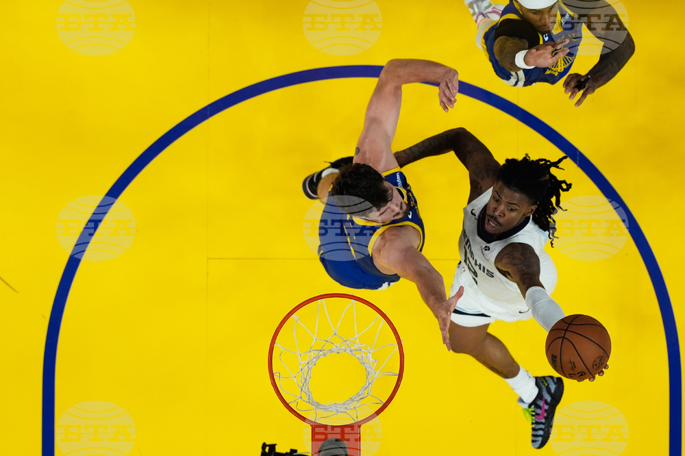 Memphis Grizzlies guard Ja Morant, bottom, drives to the basket against Golden State Warriors forward Jonathan Kuminga during the first half of an NBA basketball game in San Francisco, Monday, Oct. 27, 2025. (AP Photo/Jeff Chiu)