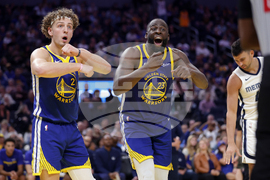 Golden State Warriors' Brandin Podziemski and Draymond Green look for a traveling call against Memphis Grizzlies in 4th quarter of Dubs' 131-118 win during NBA game at Chase Center in San Francisco on Monday, Oct. 27, 2025. (Scott Strazzante/San Francisco Chronicle via AP)