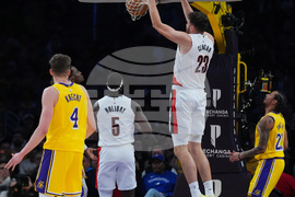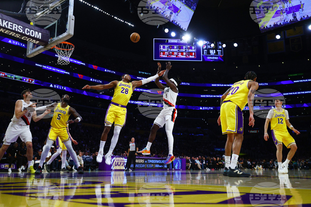 Los Angeles Lakers forward Rui Hachimura (28) blocks the ball against Portland Trail Blazers guard Jrue Holiday (5) during the second half of an NBA basketball game Monday, Oct. 27, 2025, in Los Angeles. (AP Photo/Ethan Swope)