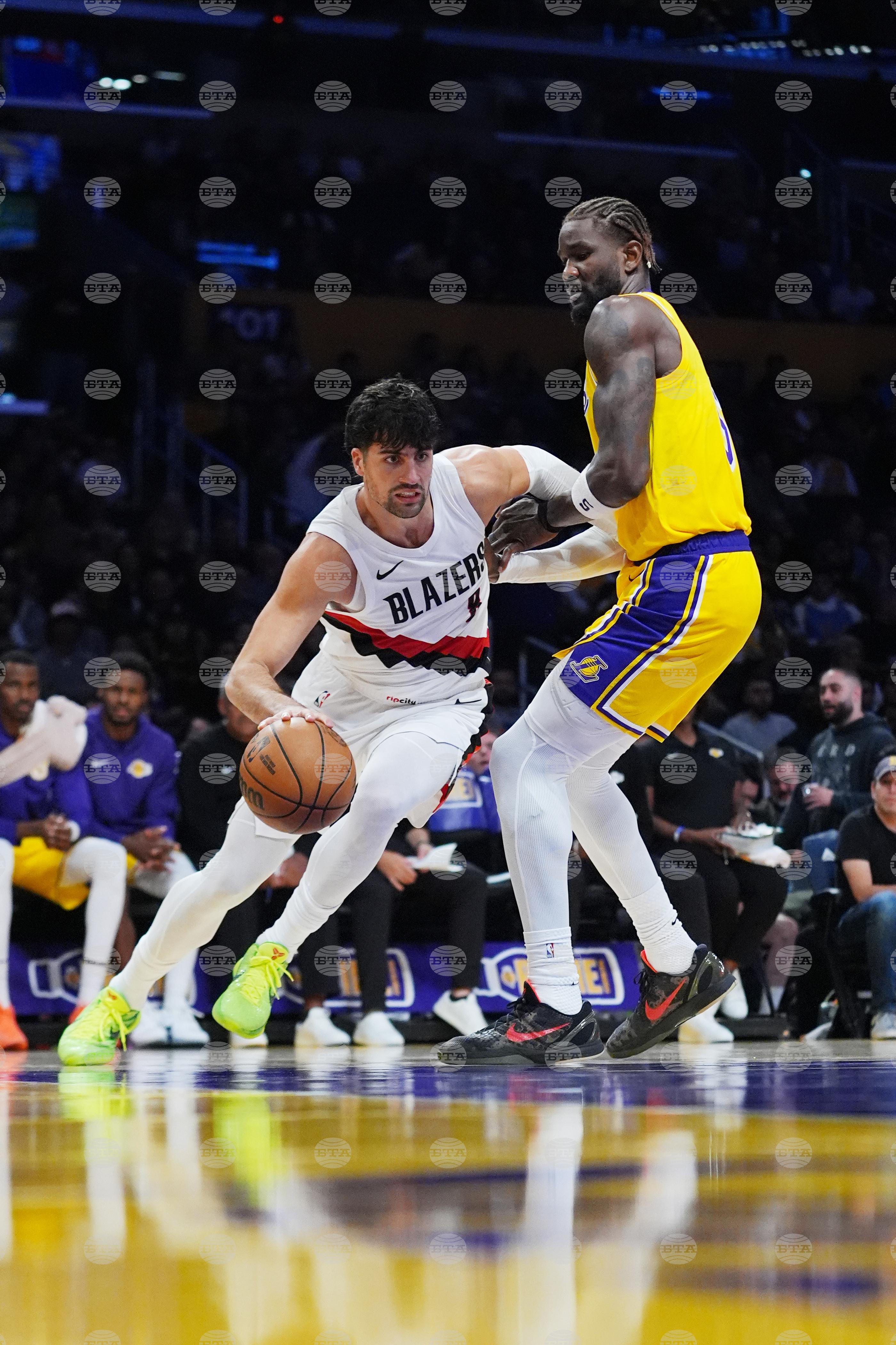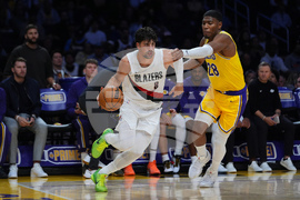 Portland Trail Blazers forward Deni Avdija (8) is defended by Los Angeles Lakers forward Dalton Knecht (4) during the second half of an NBA basketball game Monday, Oct. 27, 2025, in Los Angeles. (AP Photo/Ethan Swope)