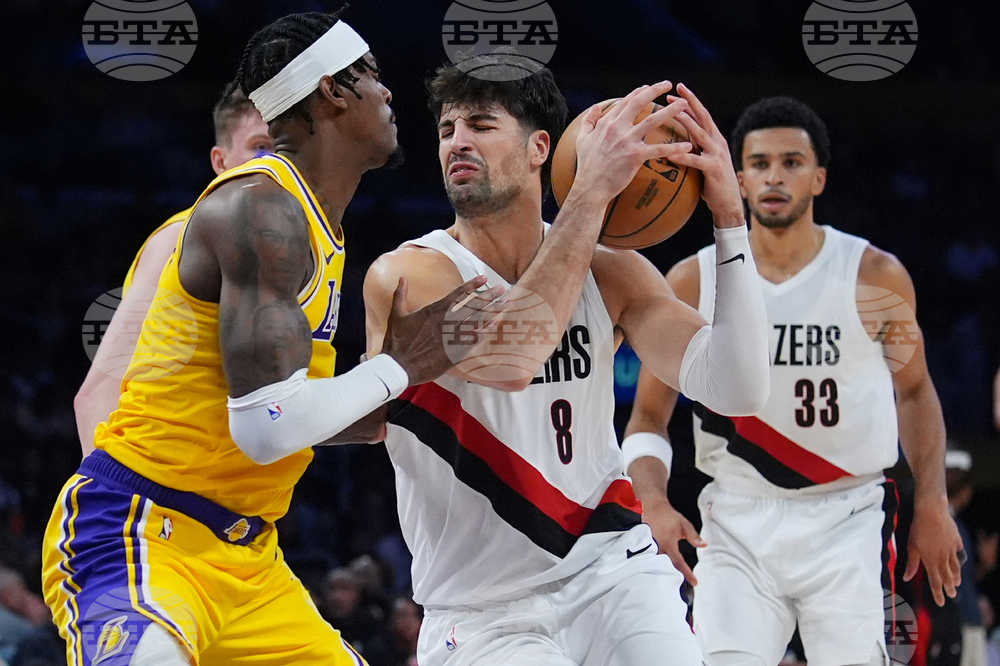 Portland Trail Blazers forward Deni Avdija (8) reacts while being defended by the Los Angeles Lakers during the second half of an NBA basketball game Monday, Oct. 27, 2025, in Los Angeles. (AP Photo/Ethan Swope)