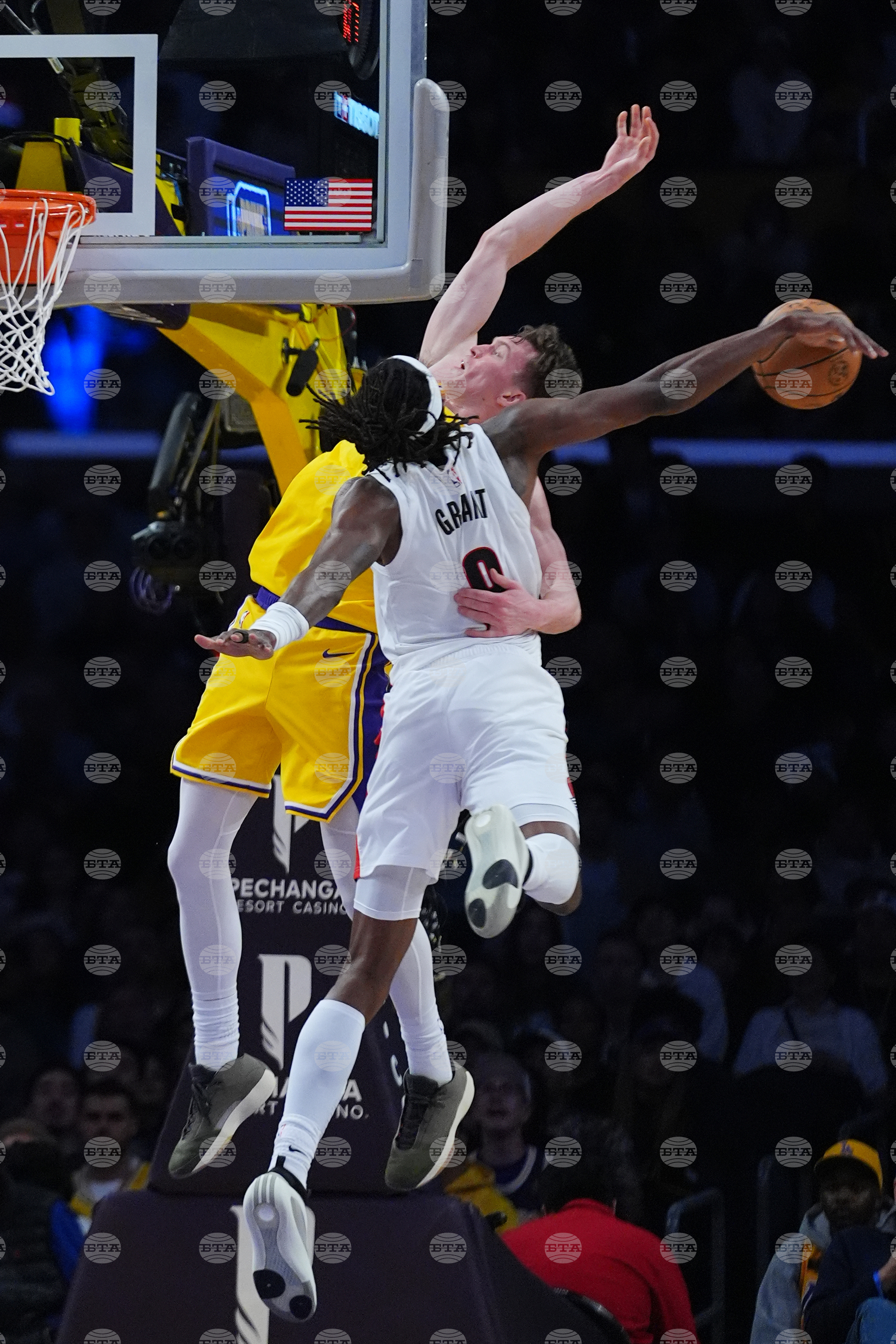 Portland Trail Blazers forward Jerami Grant (9) and Los Angeles Lakers forward Dalton Knecht (4) collide at the basket during the second half of an NBA basketball game Monday, Oct. 27, 2025, in Los Angeles. (AP Photo/Ethan Swope)