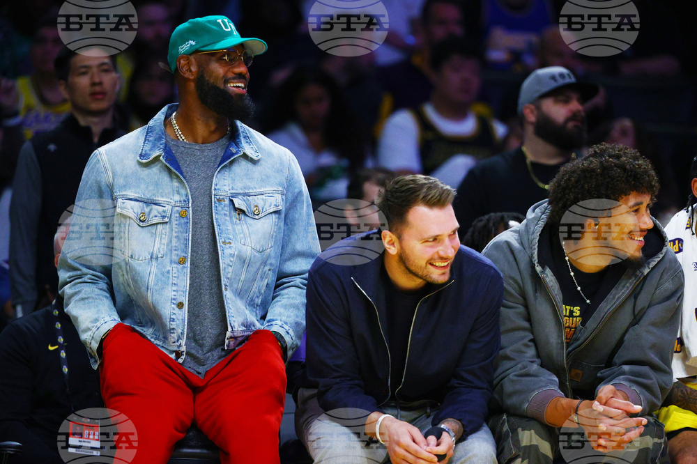 Los Angeles Lakers forward LeBron James (23) and Los Angeles Lakers guard Luka Doncic (77) watch from the bench during the second half of an NBA basketball game against the Portland Trail Blazers, Monday, Oct. 27, 2025, in Los Angeles. (AP Photo/Ethan Swope)