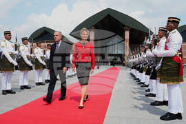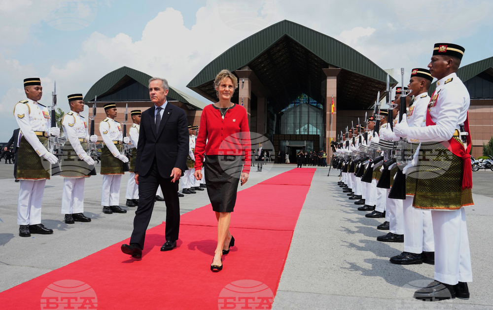 Canadian Prime Minister Mark Carney and his wife Diana Fox Carney board a government plane in Kuala Lumpur, Malaysia, Tuesday, Oct. 28, 2025. (Adrian Wyld/The Canadian Press via AP)