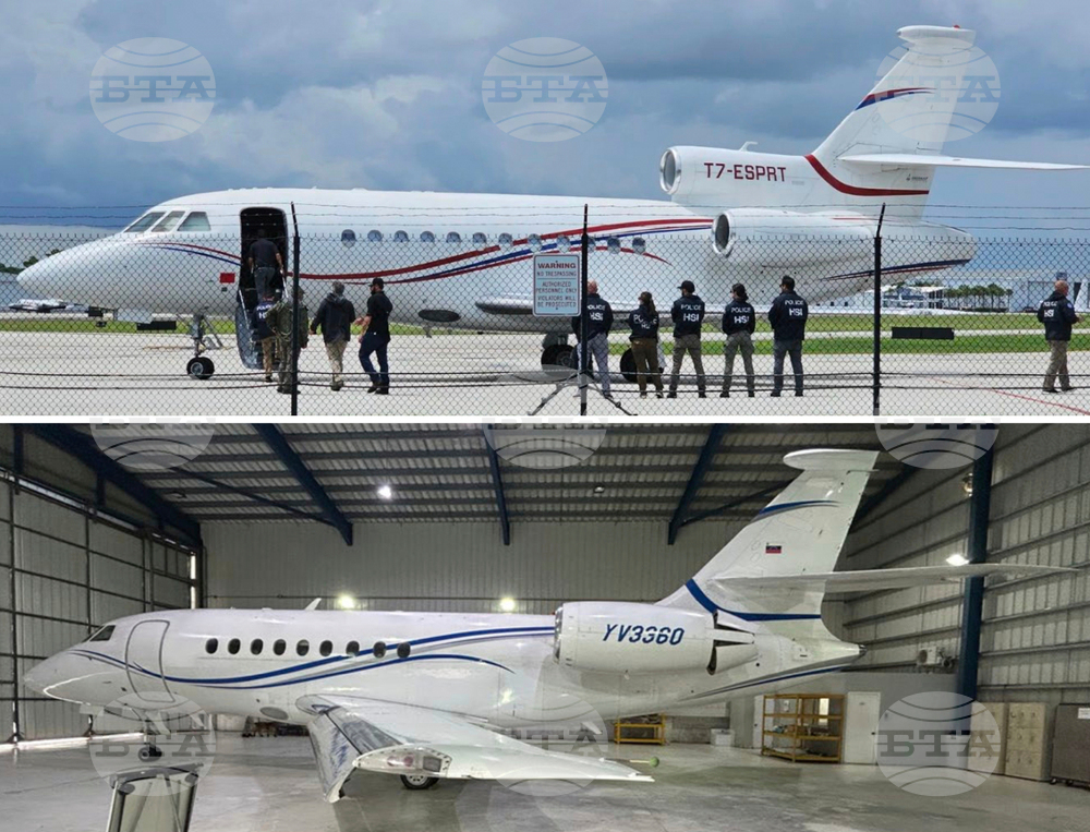 This combination of images obtained from 2025 documents released by the U.S. District Court for the Southern District of Florida, shows a Dassault Falcon 900 EX, with the tail number T7-ESPRT, that was seized in Santo Domingo, Dominican Republic, at the request of the United States in May 2024, top, and a Dassault Falcon 2000EX, with the tail number YV3360, seized in Santo Domingo at the request of the United States in February 2025, bottom. (U.S. District Court for the Southern District of Florida via AP)