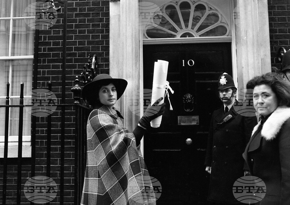 FILE - Actress Prunella Scales delivers a petition carrying the signatures of 100 prominent women to 10 Downing Street, London on February 11, 1975. (AP Photo/Robert Dear, File)