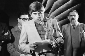 На снимката: София (11 май 1987) Художникът Антон Дончев на тържественото откриване на Общата художествена изложба "Декоративни приложни изкуства" в изложбената зала на Съюза на българските художници на ул. "Шипка" 6 в София. Пресфото-БТА снимка: Росен Маринов/Архив